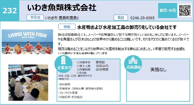 | 232 | いわき魚類株式会社 | 卸売・小売 | 〇 | いわき | 4/21 | |