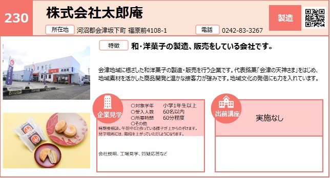 | 230 | 株式会社太郎庵 | 製造 | 〇 | 会津 | 4/20 | |