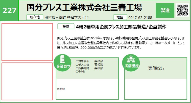 | 227 | 国分プレス工業(株) 三春工場 | 製造 | 〇 | 県中 | R7.12/22 | |